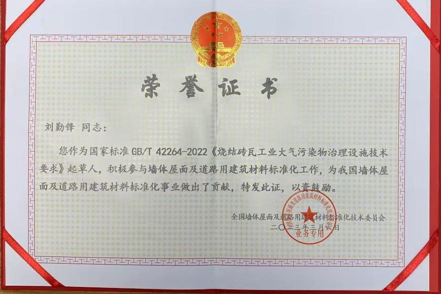 近日,全國(guó)墻體屋面及道路用建筑材料標(biāo)準(zhǔn)化技術(shù)委員會(huì),頒發(fā)榮譽(yù)證書(shū),表彰GB/T 42264-2022《燒結(jié)磚瓦工業(yè)大氣污染物治理設(shè)施技術(shù)要求》國(guó)家標(biāo)準(zhǔn)起草單位--河南亞新窯爐有限公司和河南亞新窯爐有限公司董事長(zhǎng)劉勤鋒。