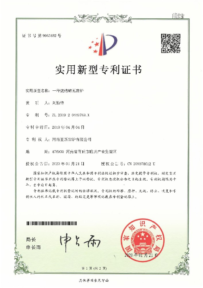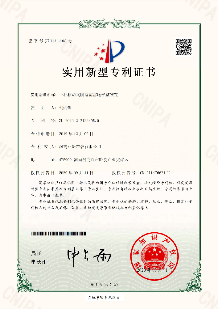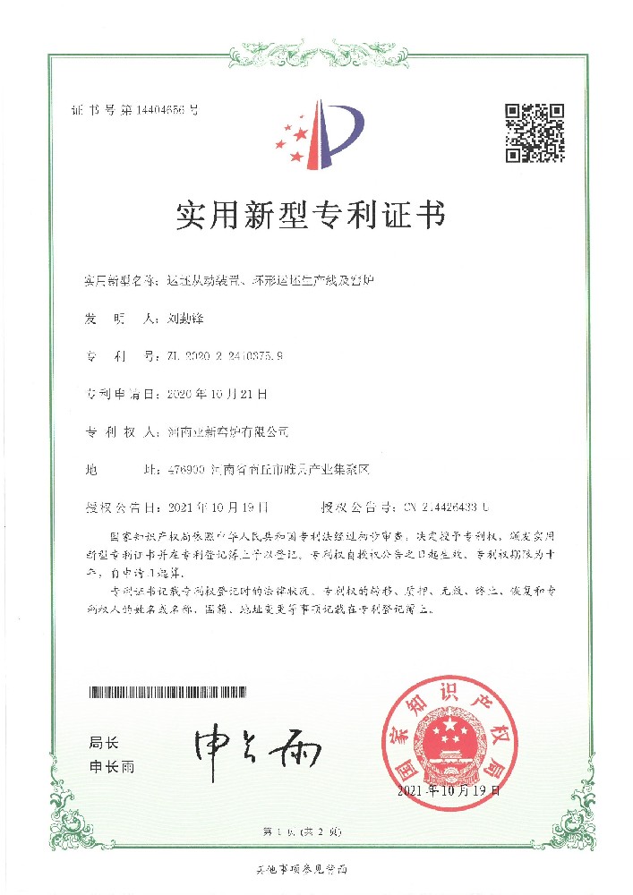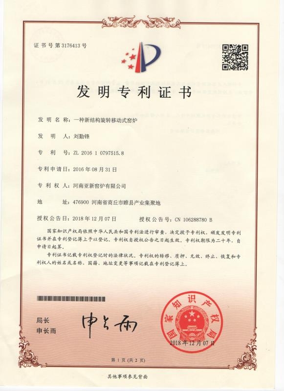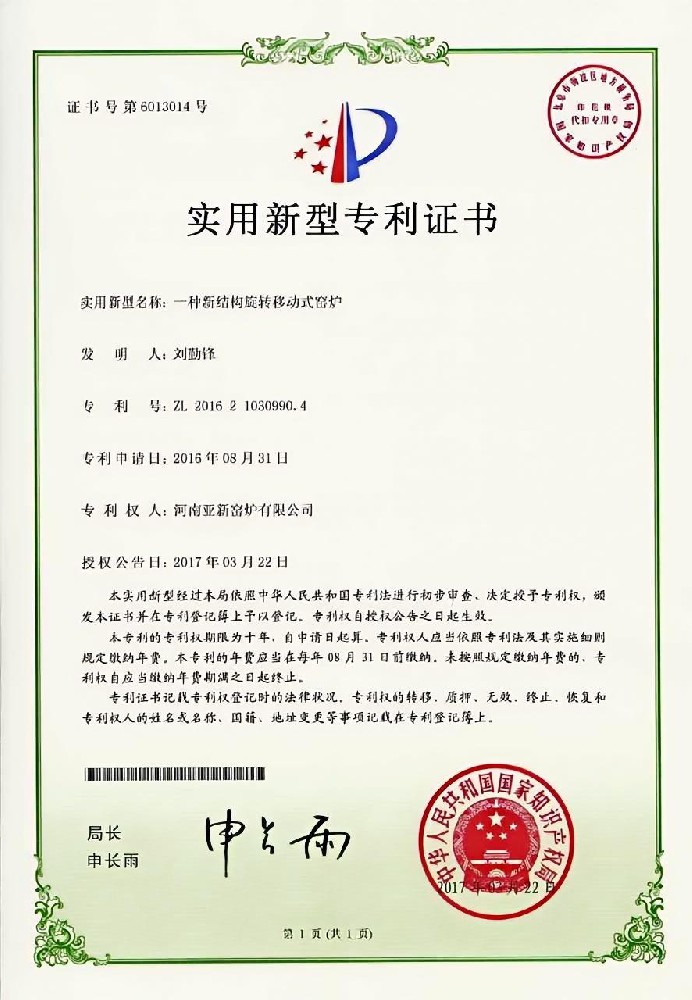 一種新結(jié)構(gòu)旋轉(zhuǎn)移動(dòng)式窯爐——發(fā)明專利證書
